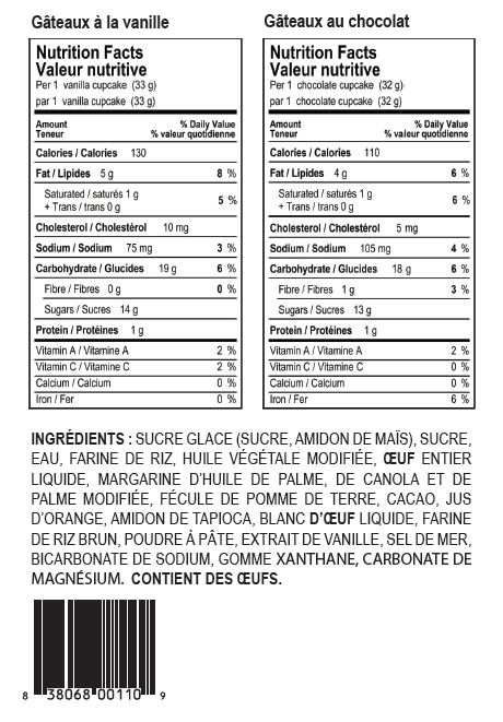 Veuillez prendre note qu’à partir du mois de mai, tous nos produits, incluant nos petits gâteaux, seront sans OGM. Nous travaillons présentement à modifier notre glaçage à gâteaux afin qu’il contienne de la margarine et des matières grasses sans OGM